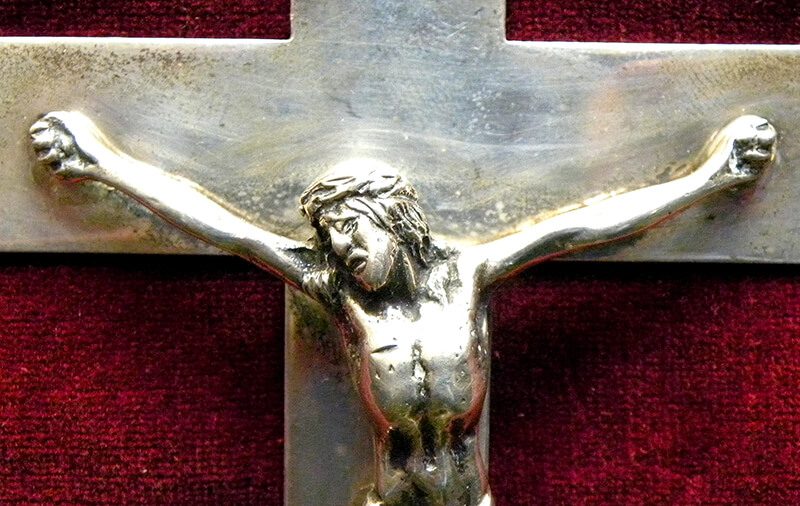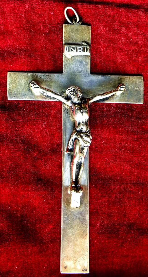 0107- Crucifijo de plata. Lleva dedicaciones de nacimientos y defunciones de la familia García y García de Castro. Medidas 14’6cm de alto, por 8cm de largo y 1cm de ancho. Peso 56gr.